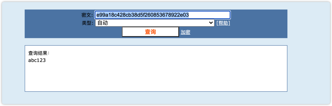 可以看到成功爆出用户名、密码,密码采用 md5 进行加密,可以到 https://www.cmd5.com/