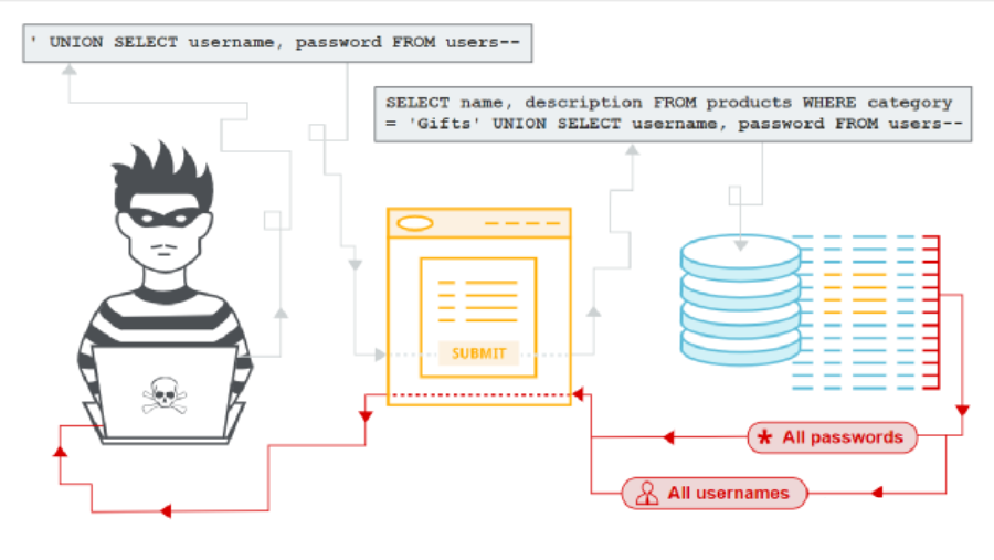 这就是 SQL 注入攻击的典型场景,由于程序员在开发数据库中,没有对用户输入数据进行校验、转义、限制等处理,导致攻击者可以通过输入恶意字符串去获取数据库中的数据。先前的很多影视网站的 VIP 会员密码就是通过类似的方式泄漏的。