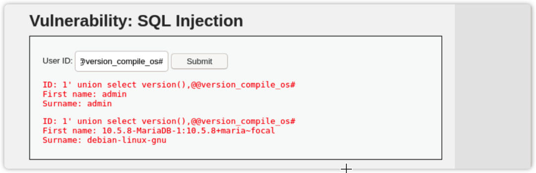 SELECT first_name, last_name FROM users WHERE user_id = '1' union select version(),@@version_compile_os#`;