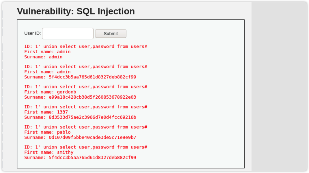 SELECT first_name, last_name FROM users WHERE user_id = '1' union select user,password from users#`;