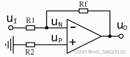 反相比例运算电路中,输入信号Ui通过电阻接到反相输入端,输出信号Uo通过一个反馈电阻Rf接到反相输入端。同相输入端通过电阻接地。