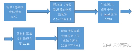 当我们拿照相片对着场景中拍摄时,光线从镜头进入照相机,我们人眼看到的场景亮度是感知亮度,场景的光子进入照相机(照相机镜头是物理光学器材,只能接收光子,无法接收什么感知亮度值),这些光子是构成了物理亮度,如果就按照这么个流程的话,那么照相机中保存场景图片的值是光子数量相关的一个值,即是物理亮度值,然后这个物理亮度值不做任何修改直接通过照相机的屏幕发射出来,我们人眼接触到这些由屏幕发射出来的光子,正好是可以产生和直接看场景一样的感知亮度,完美!看起来似乎很完美,真的可以这样吗?