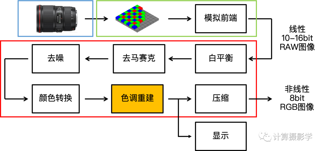 ISP在将图像编码为我们常用的8位图像之前,会进行一次所谓的色调重建的过程。而且,这个过程不仅仅是对图像的压缩保存需要,对图像的显示也是需要的: