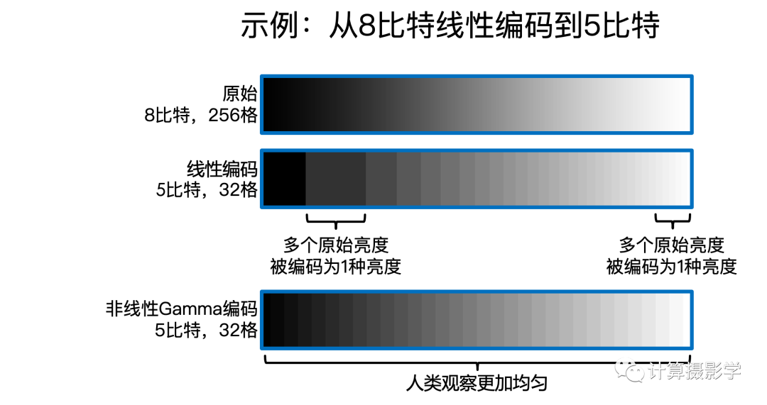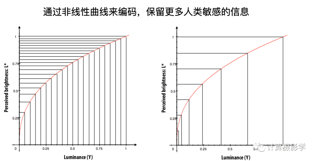 当我们对图像进行编码时,需要符合人类的感知曲线,优化编码效率。简单说,我们分配较少的bit数给人类较难区分的图像亮区,分配更多的bit数来突出人类更加敏感的图像暗区