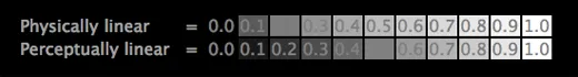 我们先看下排,下排的数值是在感知线性空间上的,没错,0.2处的亮度是0.1处的两倍,0.5处就是中间亮度,也是1.0亮度的一半,可以看到0.5的数字都没有显示出来,是因为字体颜色就是用0.5的颜色画的。每一个亮度比上一级的亮度的增量都是0.1,这就是和我们眼睛感觉的一样的。
