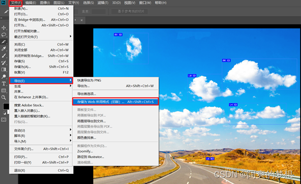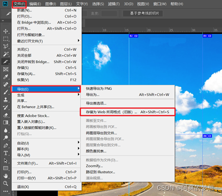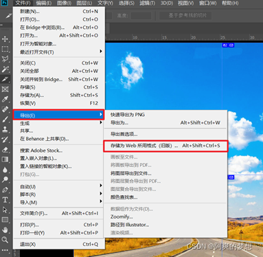4、点击“文件”,选择“导出”,再选择“存储为web所用格式(旧版)”。