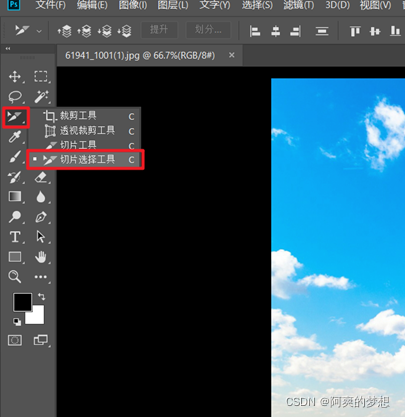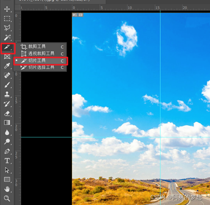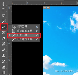 4、在左边的工具栏,右键“切片工具”,选择“切片工具”,此时会出现切刀的指标。