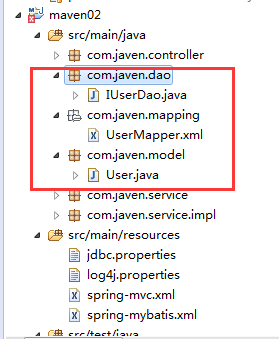 下面主要介绍三大框架的整合,至于环境的搭建以及项目的创建,参看上面的博文。这次整合我分了2个配置文件,分别是spring-mybatis.xml,包含spring和mybatis的配置文件,还有个是spring-mvc的配置文件,此外有2个资源文件:jdbc.propertis和log4j.properties。完整目录结构如下(最后附上源码下载地址):