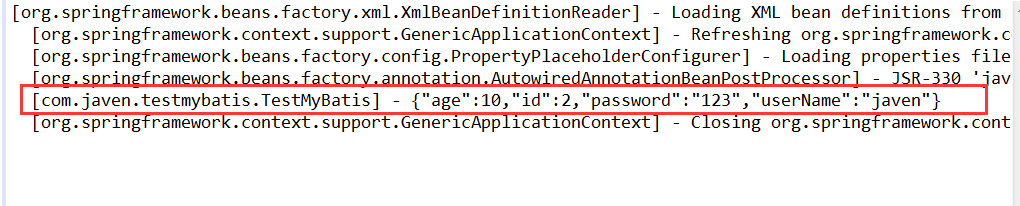 如果测试成功,表示Spring和Mybatis已经整合成功了。输出信息使用的是Log4j打印到控制台。