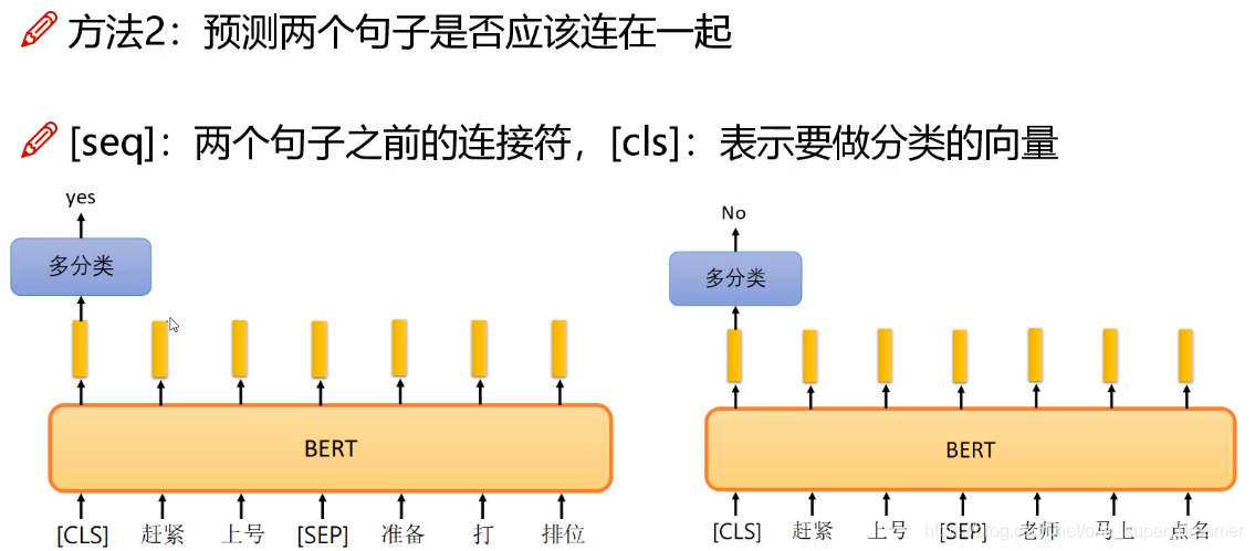特殊字符也需要编码。如下图左边的句子应该连在一起情况,但是右边的两个句子不应该连在一起情况。[cls]在进行编码的时候会考虑右边的所有结果,在编码时会判断是否应该连在一起。在对[cls]进行编码的时候也需要做一个分类任务,就是一个二分类任务,输出结果是判断两个句子是否应该连在一起。