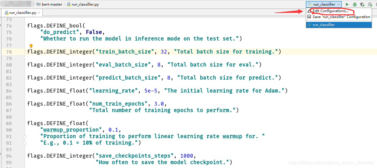 bert的核心代码解读在https://blog.csdn.net/one_super_dreamer/article/details/105344649,本文主要介绍训练实例。
