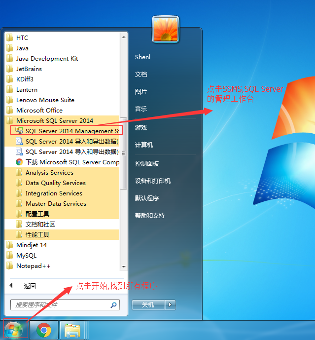 1. 首先打开SSMS,在“开始”→“所有程序”找到“Microsoft SQL Server 2014”,然后点击“SQL Server 2014 Management Studio”: