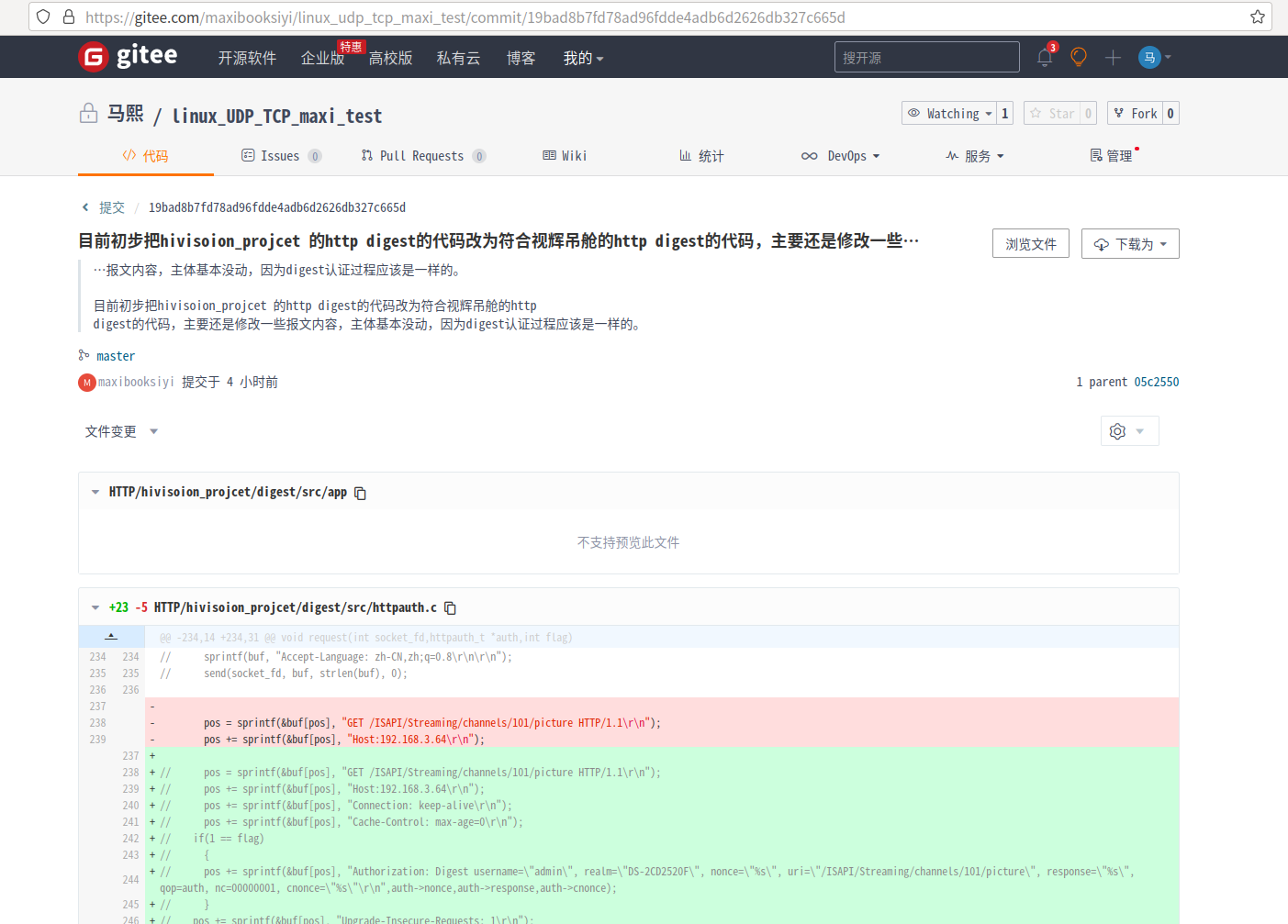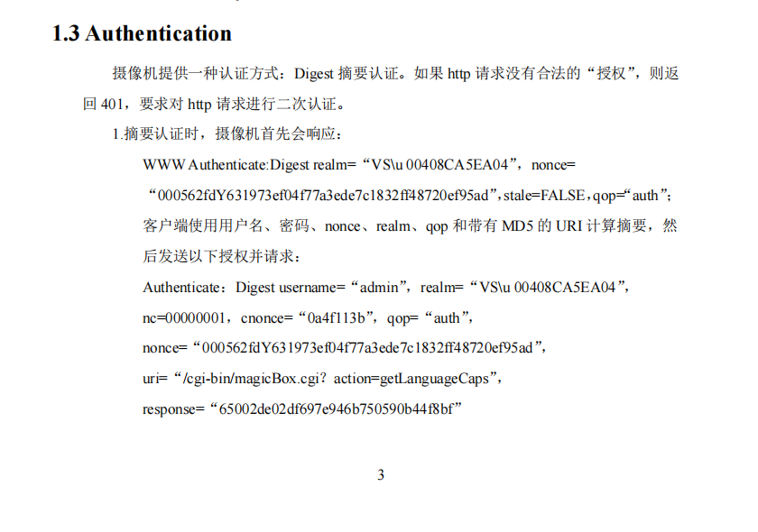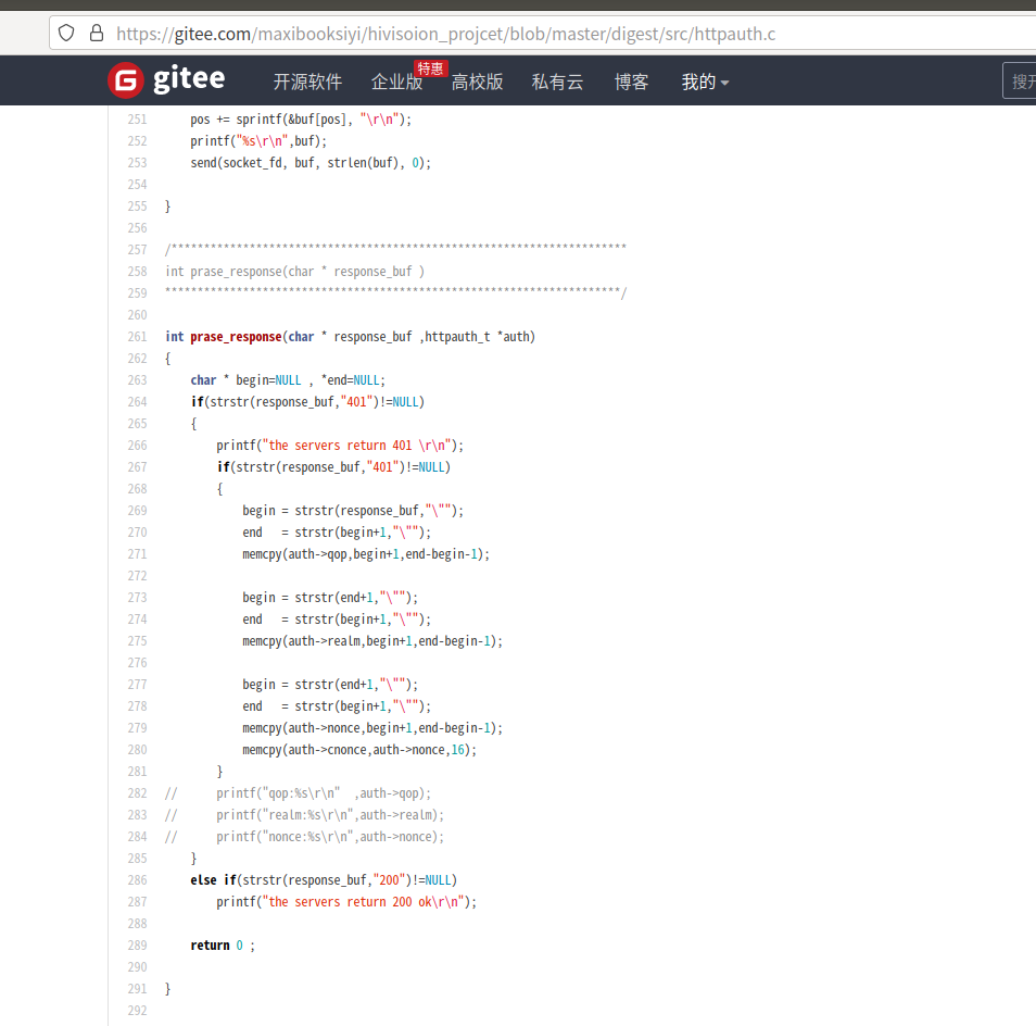 //函数功能:获取子串//函数参数:source目标字符串;start_str开始字符串;end_chr结束字符//返回值:成功返回该子串,失败返回NULLchar* GetTargetStr(const char*source,char*start_str,char end_chr){char *p_start = NULL;char *p_end = NULL;p_start = strstr(source,start_str);p_start += strlen(start_str);p_end = strchr(p_start,end_chr);char *ret = NULL;if(p_end != NULL){ret = (char*)malloc(p_end - p_start +1);ret[p_end - p_start] = '\0';memcpy(ret,p_start,p_end - p_start);}return ret;}//函数功能:获取WWW_Authenticate认证信息//函数参数:self通信句柄;HttpRsp服务器响应数据包;HttpRspSize数据包的尺寸;head_len头长度;user登陆用户名;pwd用户密码//返回值:成功返回OK,失败//备注:该函数中nc的值,这里客户端不保存服务器发送的nonce,所以每次都是00000001char *GetClientWWW_Authenticate(const char*response,long responseSize,int head_len\,const char*user,const char*pwd){char *realm = GetTargetStr(response,"realm=\"",'\"');char *nonce = GetTargetStr(response,"nonce=\"",'\"');char *algorithm = GetTargetStr(response,"algorithm=",',');char *qop = GetTargetStr(response,"qop=\"",'\"');assert(realm && nonce && algorithm && qop);//FIXMEchar *nc = "00000001";char *cnonce = createRandomNum(32);//需要生成随机字符串char A1[100] = {0};sprintf(A1,"%s:%s:%s",user,realm,pwd);char *md5_A1 = MD5_sign((unsigned char*)A1,strlen(A1));char A2[80] = {0};sprintf(A2,"GET:/Auth");char *md5_A2 = MD5_sign((unsigned char*)A2,strlen(A2));char contact[512] = {0};sprintf(contact,"%s:%s:%s:%s:%s:%s",md5_A1,nonce,nc,cnonce,qop,md5_A2);FREE_MALLOC(md5_A1);FREE_MALLOC(md5_A2);char *rsp = MD5_sign((unsigned char*)contact,strlen(contact));char WWW_Authenticate[256] = {0};char*format = "Digest username=\"%s\",realm=\"%s\",qop=\"%s\",algorithm=\"%s\",uri=\"/Auth\",nonce=\"%s\",nc=%s,cnonce=\"%s\",response=\"%s\"";sprintf(WWW_Authenticate,format,user,realm,qop,algorithm,nonce,nc,cnonce,rsp);FREE_MALLOC(realm);FREE_MALLOC(qop);FREE_MALLOC(algorithm);FREE_MALLOC(nonce);FREE_MALLOC(cnonce);FREE_MALLOC(rsp);return strdup(WWW_Authenticate);}