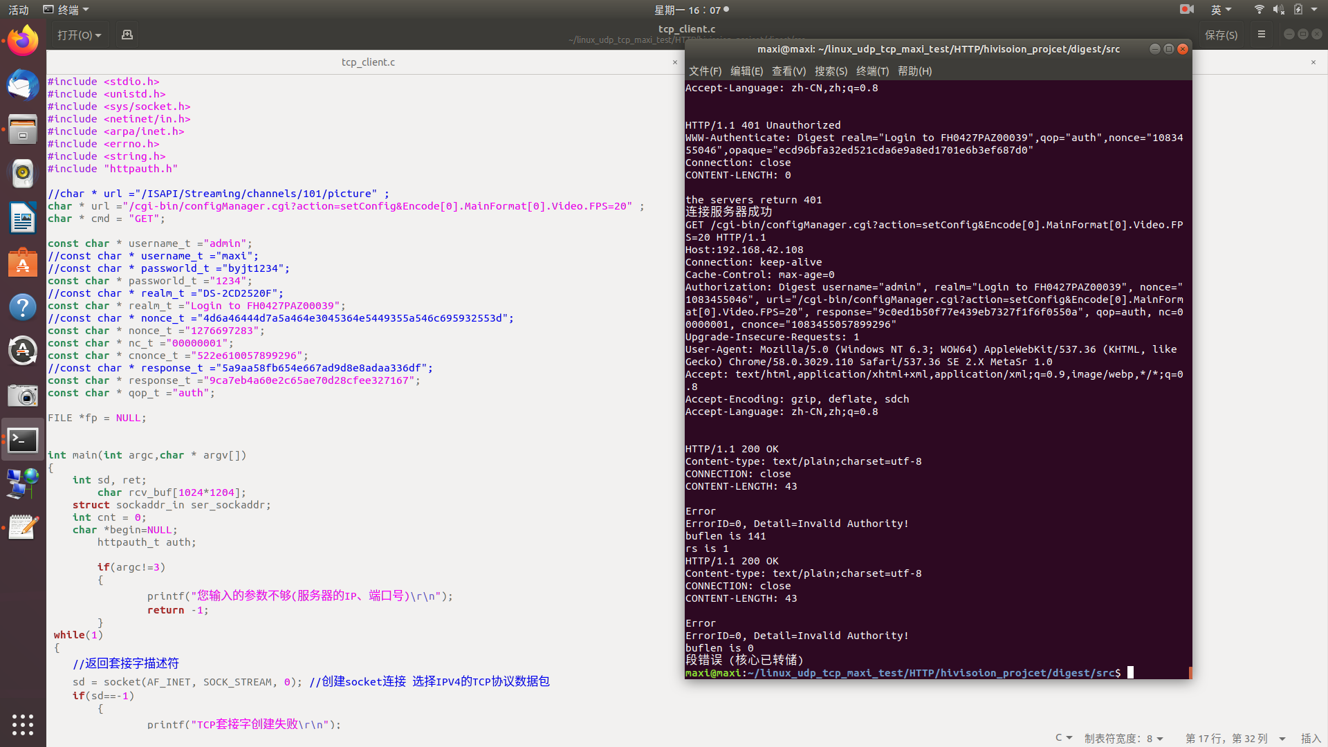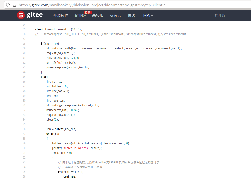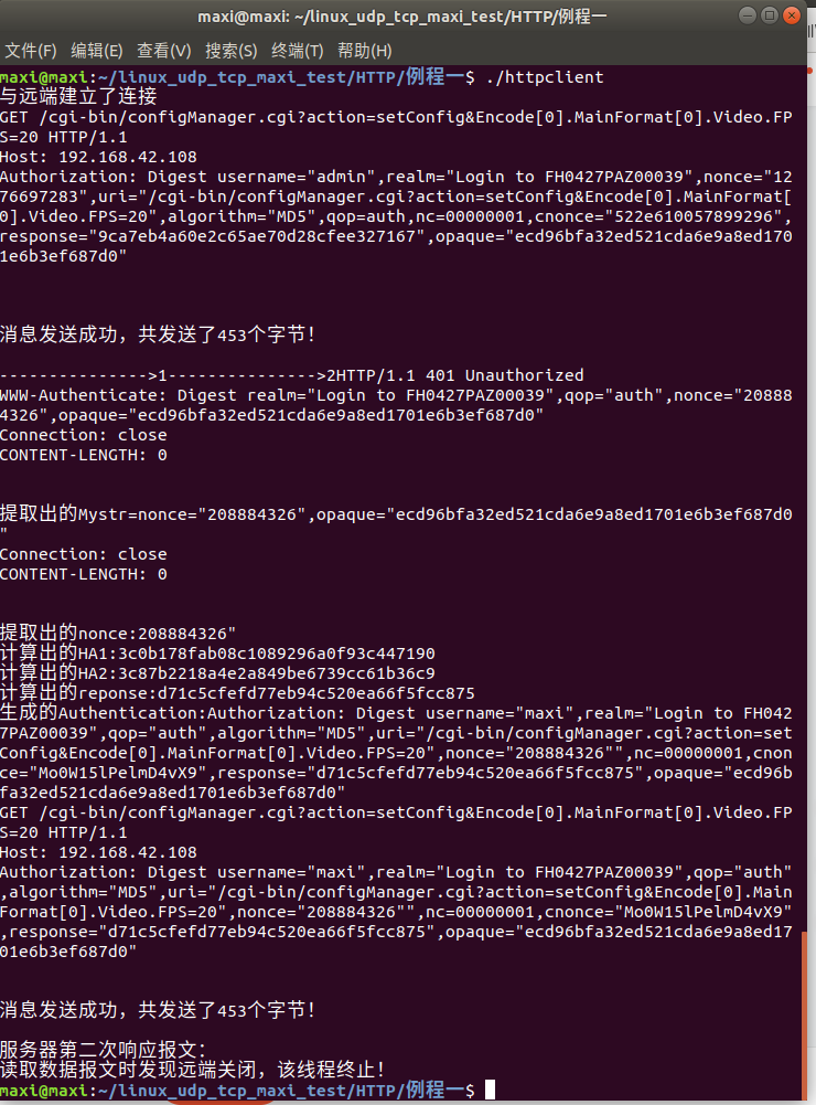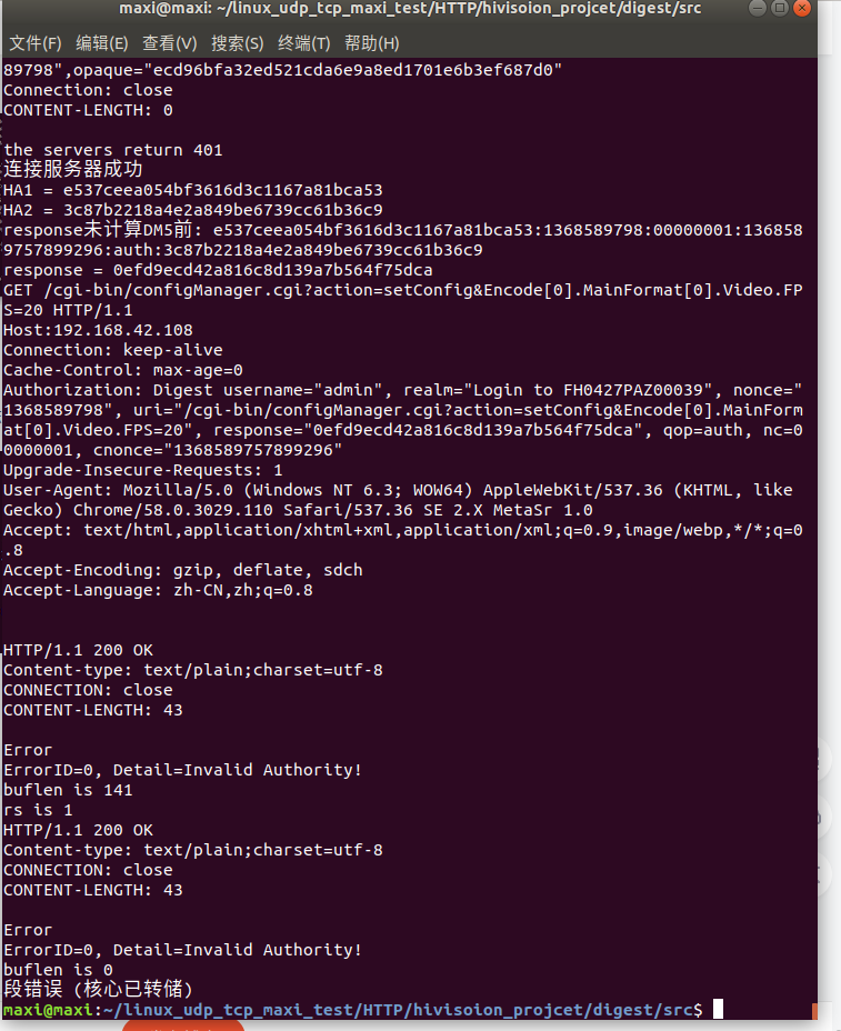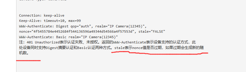 现在可以做到每次百分之百digest认证成功了,因为保证了nonce提取的正确,其实那个提取函数prase_response没有问题,仔细分析了下它的逻辑,还有我用printf打印出begin end,发现提取的位置没有问题,但是打印出的nonce就是有时候比真在的nonce多出一两个字符,我又看到这个代码定义的nonce的字符串长度是64,那么我想到是不是之前出现过的类似情况,字符串最末为没有字符串结束字符,导致把后面的也接着打印出来了,我开始想加个字符串截断函数,后来还是选择就在字符串应该结束的位置后面一位赋值'\0',知道是赋值这个也是看了:C语言字符数组和字符串_C语言中文网 ,也就是在之前代码的基础上加了这句 auth->nonce[end-begin-1]={'\0'}; 然后编译再运行,果然就每次都更改成功了,没有再出现因为nonce提取错误导致有时候digest认证不成功的情况,现在也明白为什么总是提取出的nonce比真在的nonce多出个3或者83等等的原因了,其实提取得正确,就是缺少字符串结束字符,没有这个结束字符,你正确的字符串在使用的时候就可能被别人误读,多取,导致出现这种情况。