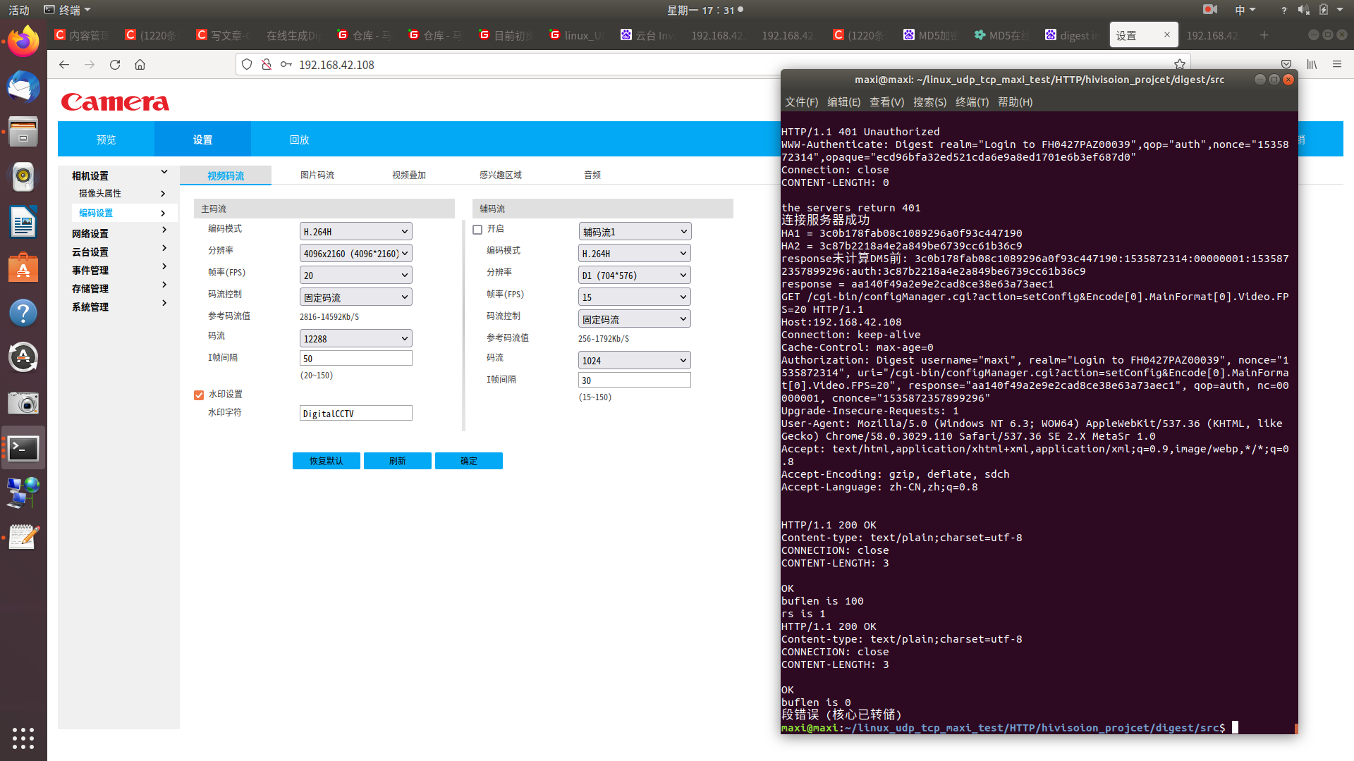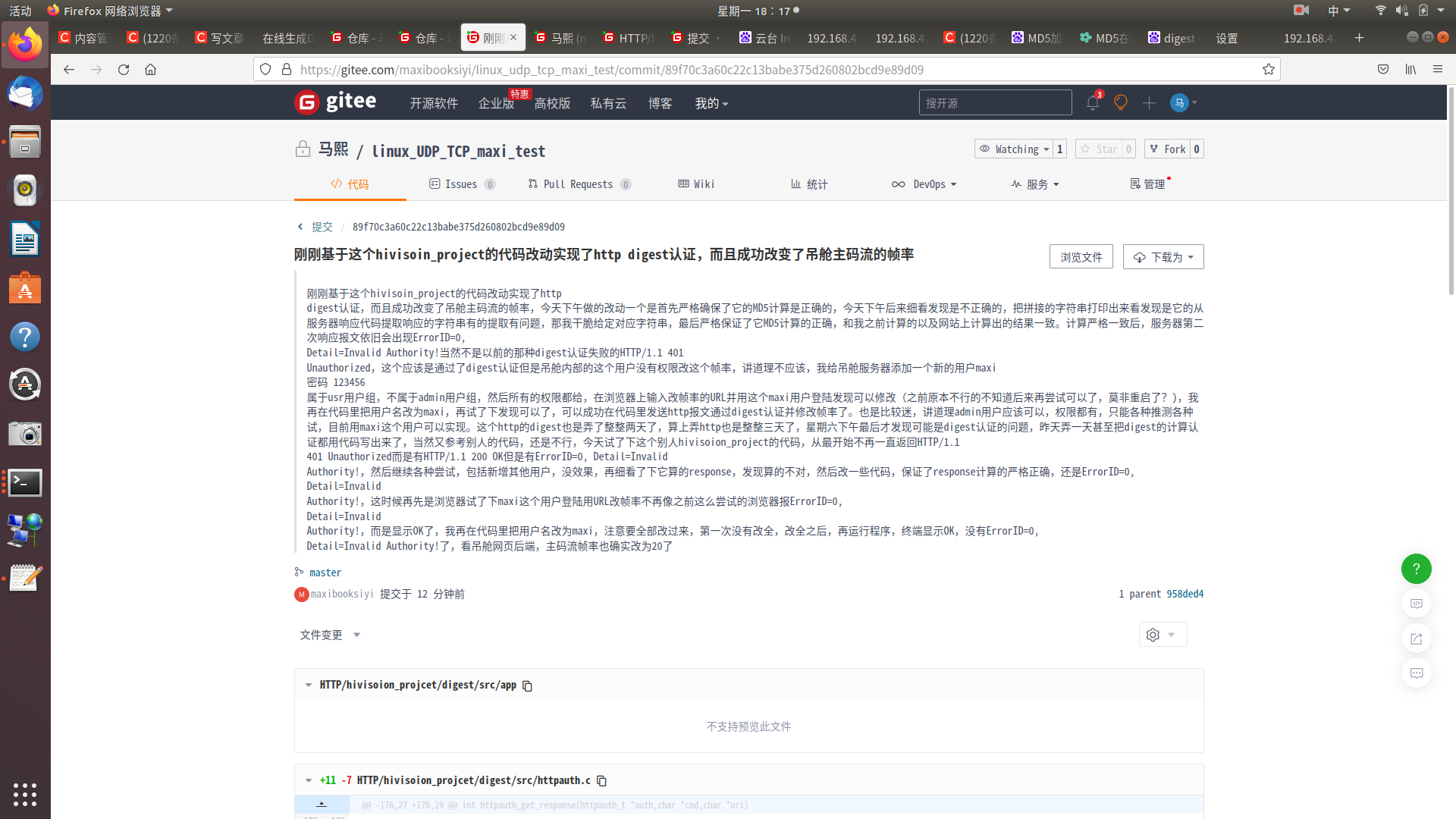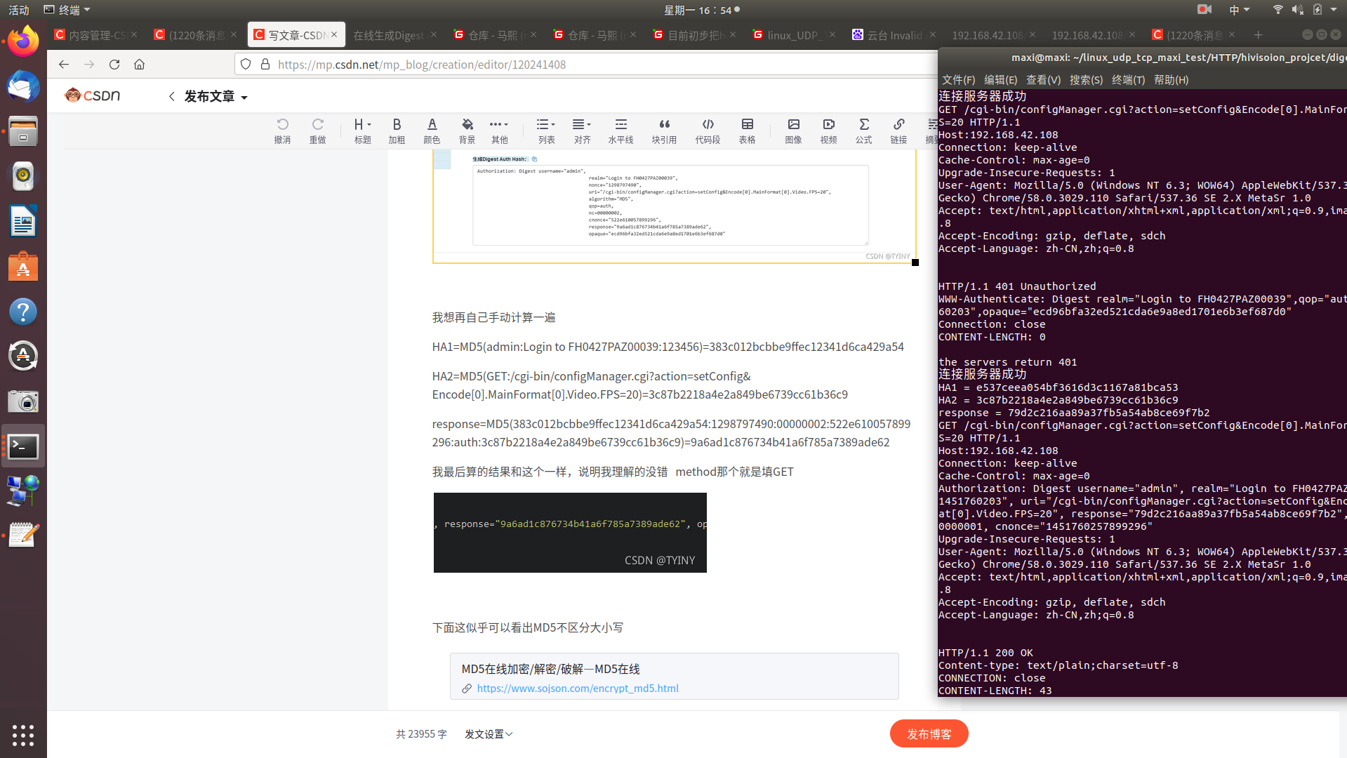 现在可以做到每次百分之百digest认证成功了,因为保证了nonce提取的正确,其实那个提取函数prase_response没有问题,仔细分析了下它的逻辑,还有我用printf打印出begin end,发现提取的位置没有问题,但是打印出的nonce就是有时候比真在的nonce多出一两个字符,我又看到这个代码定义的nonce的字符串长度是64,那么我想到是不是之前出现过的类似情况,字符串最末为没有字符串结束字符,导致把后面的也接着打印出来了,我开始想加个字符串截断函数,后来还是选择就在字符串应该结束的位置后面一位赋值'\0',知道是赋值这个也是看了:C语言字符数组和字符串_C语言中文网 ,也就是在之前代码的基础上加了这句 auth->nonce[end-begin-1]={'\0'}; 然后编译再运行,果然就每次都更改成功了,没有再出现因为nonce提取错误导致有时候digest认证不成功的情况,现在也明白为什么总是提取出的nonce比真在的nonce多出个3或者83等等的原因了,其实提取得正确,就是缺少字符串结束字符,没有这个结束字符,你正确的字符串在使用的时候就可能被别人误读,多取,导致出现这种情况。