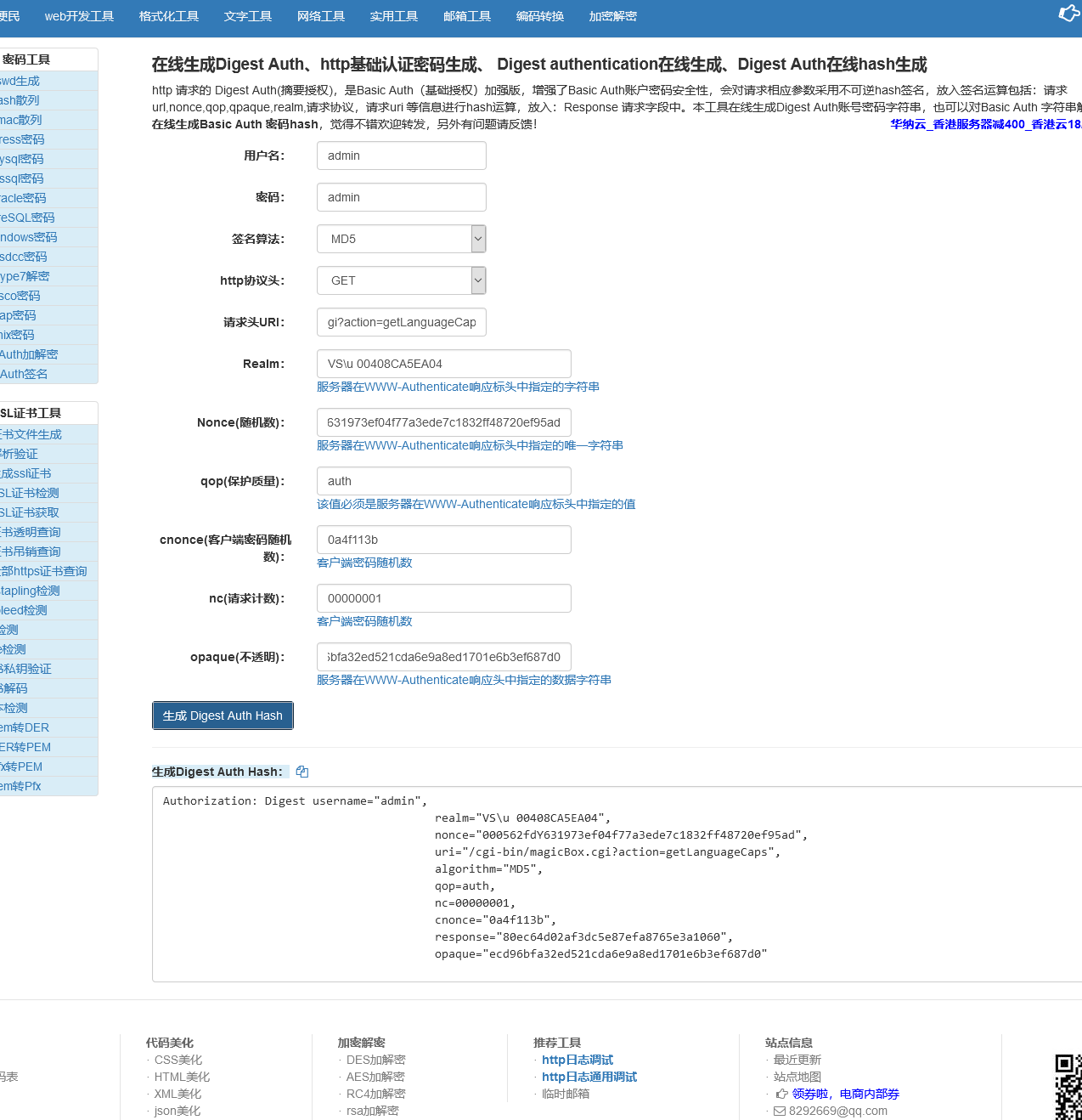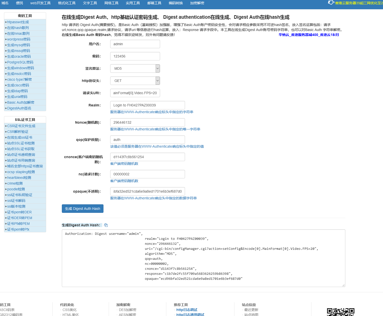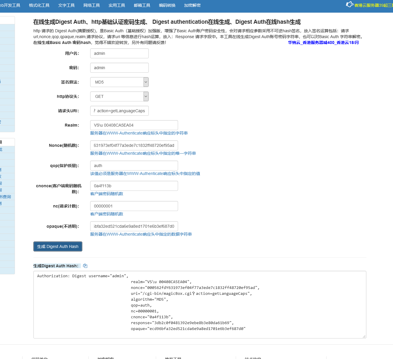 在线生成Digest Auth、http基础认证密码生成、 Digest authentication在线生成、Digest Auth在线hash生成--查错网