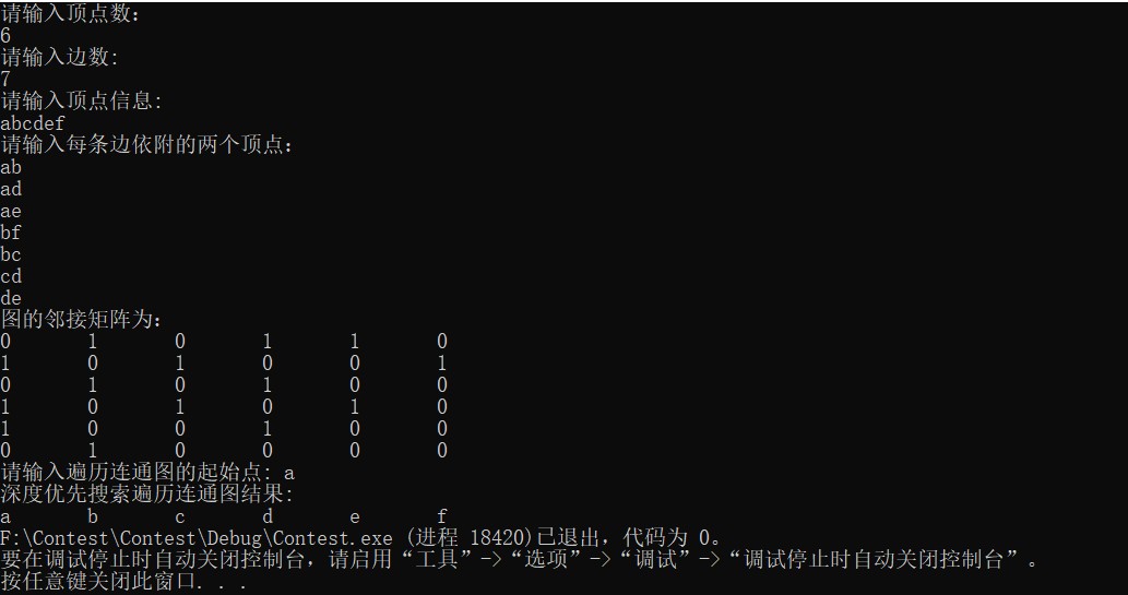 {int v;VexType c;AMGragh G;CreateAMGraph(G);print(G);cout << "请输入遍历连通图的起始点: ";cin >> c;v = locatevex(G, c);//查找顶点u的存储下标if (v != -1){cout << "深度优先搜索遍历连通图结果: " << endl;DFS_AM(G);}else {cout << "输入顶点信息错误!请重新输入!" << endl;}return 0;