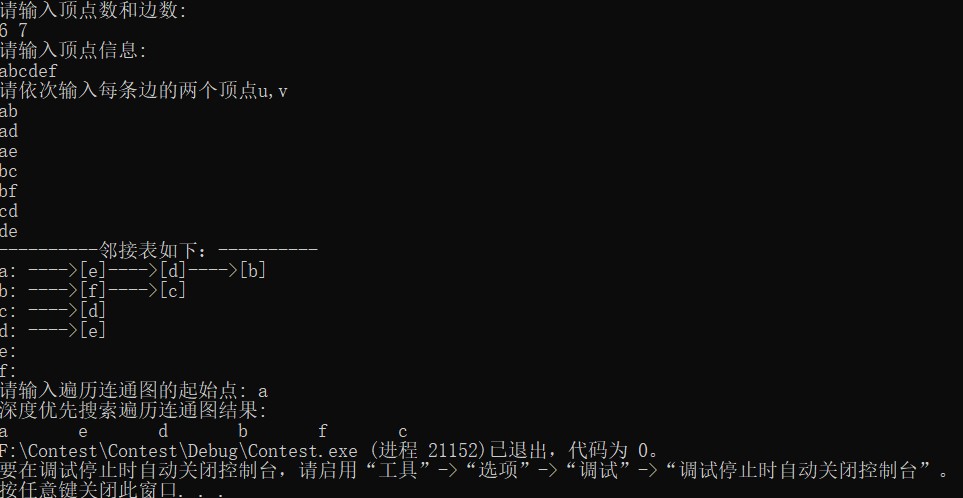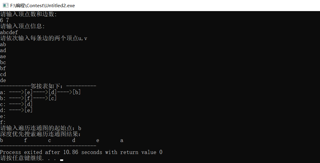 {ALGragh G;int v;VexType c;CreateALGraph(G);//创建有向图邻接表printg(G);//输出cout << "请输入遍历连通图的起始点: ";cin >> c;v = locatevex(G, c);if (v != -1){cout << "深度优先搜索遍历连通图结果: " << endl;DFS_AL(G, v);DFS_AL(G);}else{cout << "输入顶点信息错误!请重新输入!" << endl;}return 0;