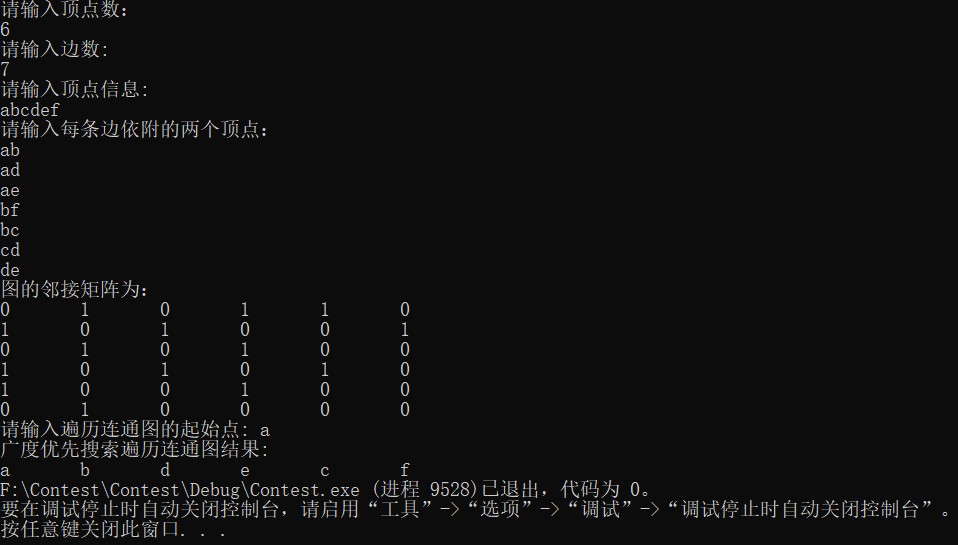 {int v;VexType c;AMGragh G;CreateAMGraph(G);print(G);cout << "请输入遍历连通图的起始点: ";cin >> c;v = locatevex(G, c);//查找顶点u的存储下标if (v != -1){cout << "广度优先搜索遍历连通图结果: " << endl;BFS_AM(G, v);BFS_AM(G);}else {cout << "输入顶点信息错! 请重新输入!" << endl;}return 0;