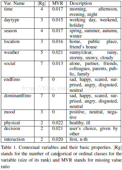 Context variables:time : Morning, Afternoon, Evening, Nightdaytype : Working day, Weekend, Holidayseason : Spring, Summer, Autumn, Winterlocation : Home, Public place, Friend's houseweather : Sunny / clear, Rainy, Stormy, Snowy, Cloudysocial : Alone, My partner, Friends, Colleagues, Parents, Public, My familyendEmo : Sad, Happy, Scared, Surprised, Angry, Disgusted, NeutraldominantEmo : Sad, Happy, Scared, Surprised, Angry, Disgusted, Neutral mood : Positive, Neutral, Negativephysical : Healthy, Ill decision : User decided which movie to watch, User was given a movieinteraction : first interaction with a movie, n-th interaction with a movie Context values in the database corespond to this order.(for example: daytype-> 1 = Working day, 2 = Weekend, 3 = Holiday