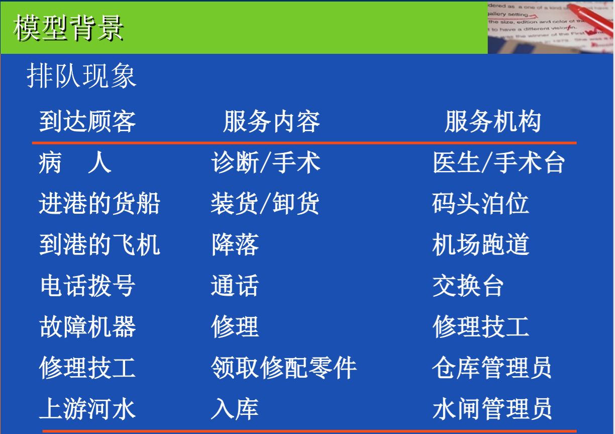 排队论又叫随机服务系统理论或公用事业管理中的数学方法。它是研究各种各样的排队现象的。它所要解决的主要问题是:在排队现象中设法寻求能够达到服务标准的最少设备,使得在满足服务对象条件下,服务机构的花费最为经济,使服务系统效率最高。排队现象作为一种随机现象,所采用的主要工具是研究随机现象规律的概率论。它把所需研究的问题形象地描述成顾客(如电话用户、发生故障的机床等)来到服务台前(如电话线路维修工人等)要求接待,如果“服务台”已被其他顾客占用,那么就得排队等待;另一方面服务台”也时而清闲,时而忙碌。排队论就是人们通过数学方法求出顾客等待时间、排队长度等的概率分布,以便作出决策。目前排队论在社会生活的各方面已有广泛而深入的应用,如在水库用水量的调度、存储问题、生产流水线的安排、电力网的设计、铁路分车场的调度等方面都可运用排队论的基本理论来进行计算,从而获得合理的解决办法。