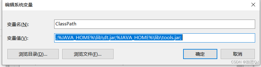 3.新建ClassPath变量,方法同JAVA_HOME一样(.用以告诉JRE需要在当前路径下搜索Java类,在编译和运行时,Java程序还需要JDK的lib路径下的dt.jar和tools.jar文件中的Java类,因此还需要把这俩个文件也添加到环境变量中)。