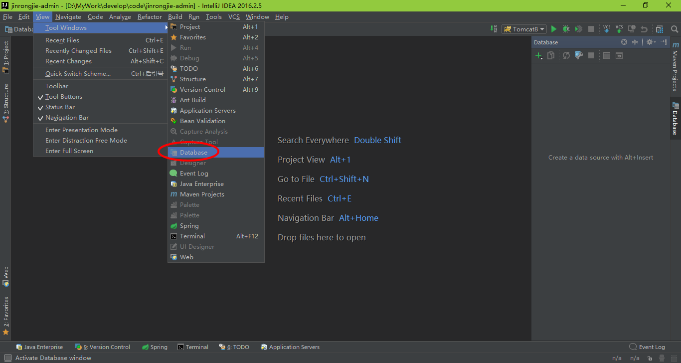 先从菜单View→Tool Windows→Database打开数据库工具窗口,如下图所示: