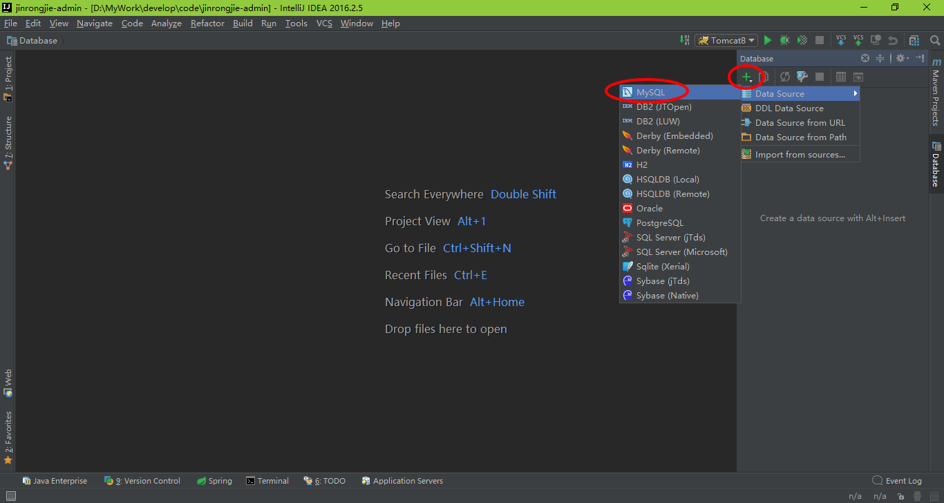 点击Database工具窗口左上角添加按钮“+”,选择数据库类型,这里以MySQL为例,如下图所示:
