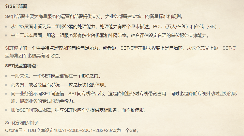 在后来的腾讯内部讲义《解密腾讯海量服务之道》里,专门有一章就叫“分 Set 部署”,罗列了这种分布式架构方便扩容和运维的种种优点,骄傲之情四处荡漾。