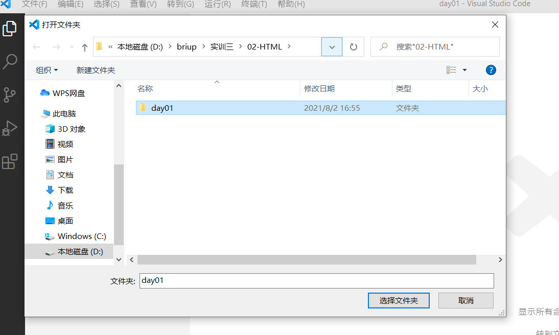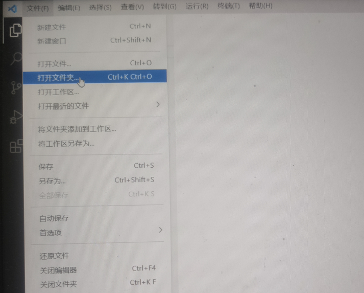 在VSCode中选择文件栏下的打开文件夹,选择之前创建的文件夹