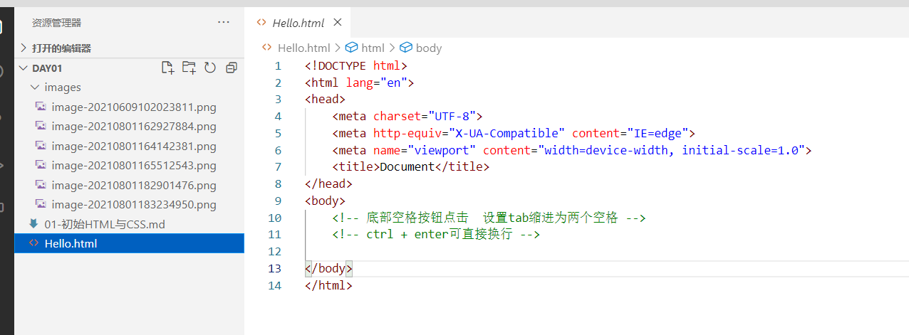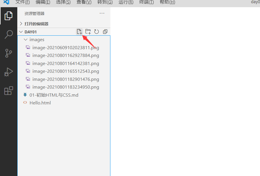 展开刚刚打开的文件夹,点击如图所示的图标可新建一个文件(要给新建的文件命名,注意后缀为.html)如图中的Hello.html