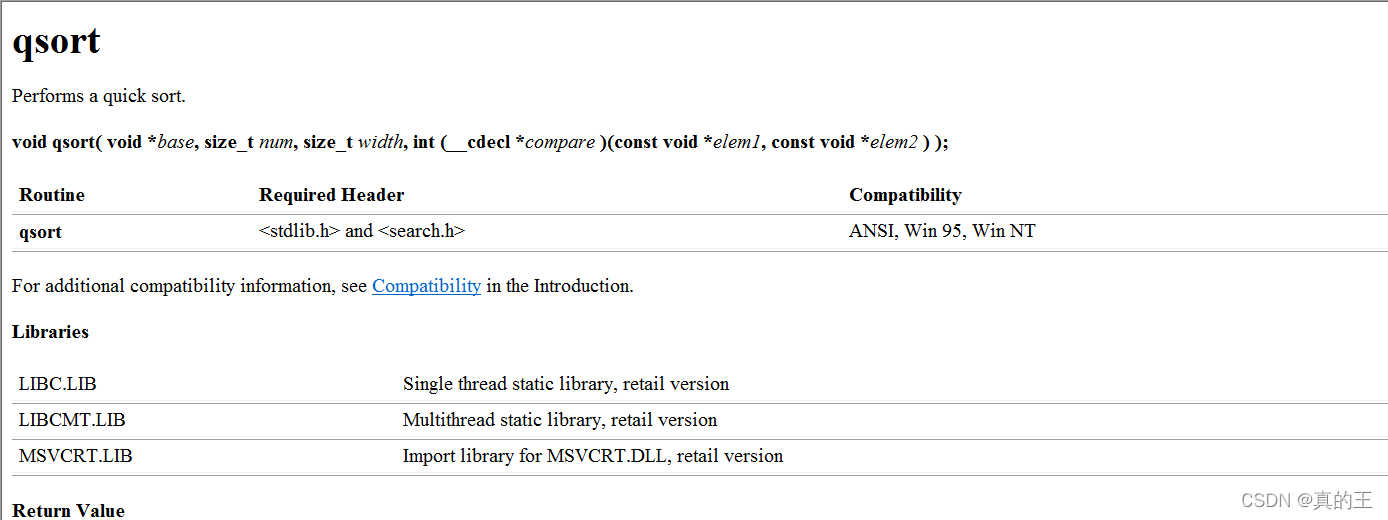 base是一个指向要排列的字符串的首地址,size_t num是字符串元素个数,size_t width是每个元素所占的字节数,最后一串是函数指针,我们发现被函数指针所指向的函数的参数是两个空指针,空指针被称为垃圾桶,什么类型的地址都可以放在它里面,const表示它只具有读取的权限但不能被修改。(具体的两个元素相比是要qsort()函数使用者自己来实现,因为qsort()函数作者也不知道你要比较的元素类型)