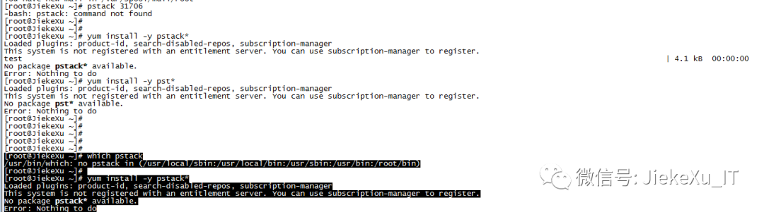 原本想着使用 pstack 命令监控一下监听日志可没想到,Linux 系统默认没有这个命令。RedHat 公司发行的 Linux 操作系统(RHEL,CentOS等等)虽提供了 pstack 工具,但要安装 gdb。