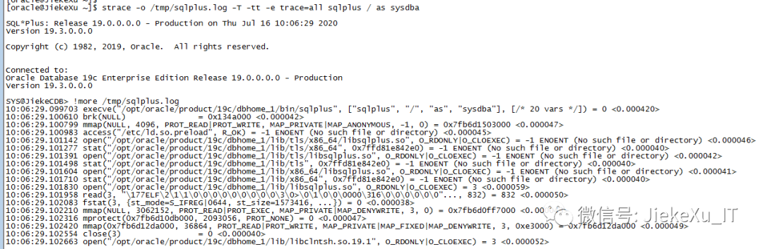 strace -o /tmp/sqlplus.log -T -tt -e trace=all sqlplus / as sysdba