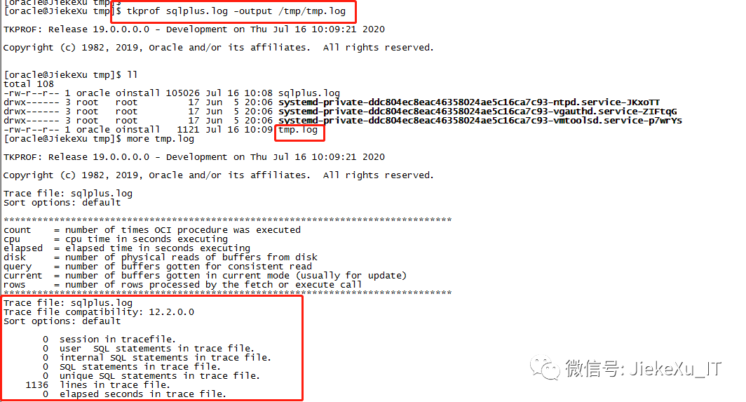 然后使用 tkprof 格式化一下 strace 文件,便可以看到一些有用的信息,我这里没有问题,故格式化后输出也很简单。
