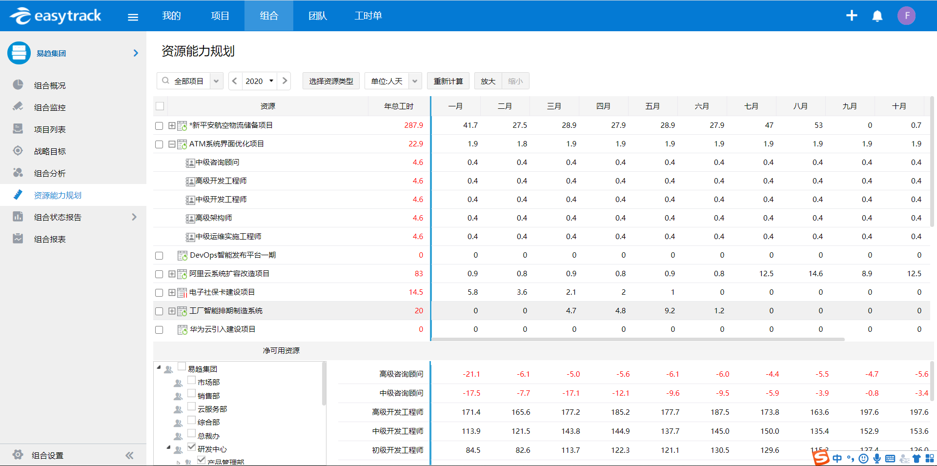 在一个企业内,负责管理资源的管理人员要对企业的资源情况非常了解:在某个时间内,企业的可净用资源有多少、企业有哪些项目、这些项目申请了多少资源、企业剩余的资源能不能满足下一阶段项目的需求……了解这些情况,才能判断出资源不足的原因。如果是资源计划不合理,需要项目经理重新做计划申请;如果资源客观不足,则考虑裁剪需求或者招聘补充人员、部分业务外包等措施。如图,资源管理者能够通过资源能力规划视图全方位了解资源状态及分配情况,为资源管理者决策和分析提供依据: