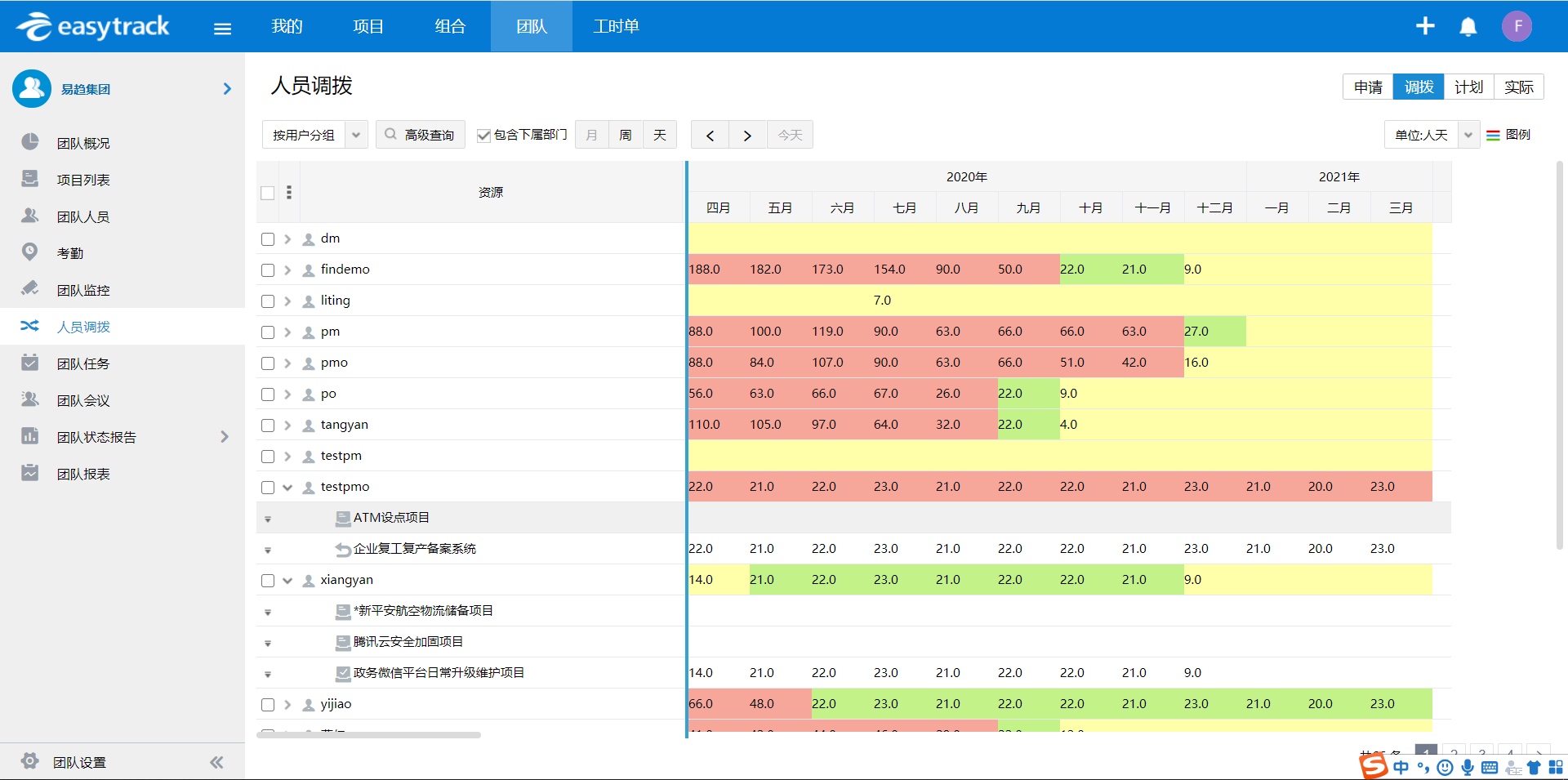对于资源经理/团队经理来说,一方面他们要负责对手中资源进行资源排期,并维护资源池;另一方面则要监控安排出去的人员所属项目的情况,了解人员的工作负荷状态。对于资源排期,资源经理/团队经理可以根据项目做人员调拨计划,并形成视图,一目了然每个人的忙闲状态,如图: