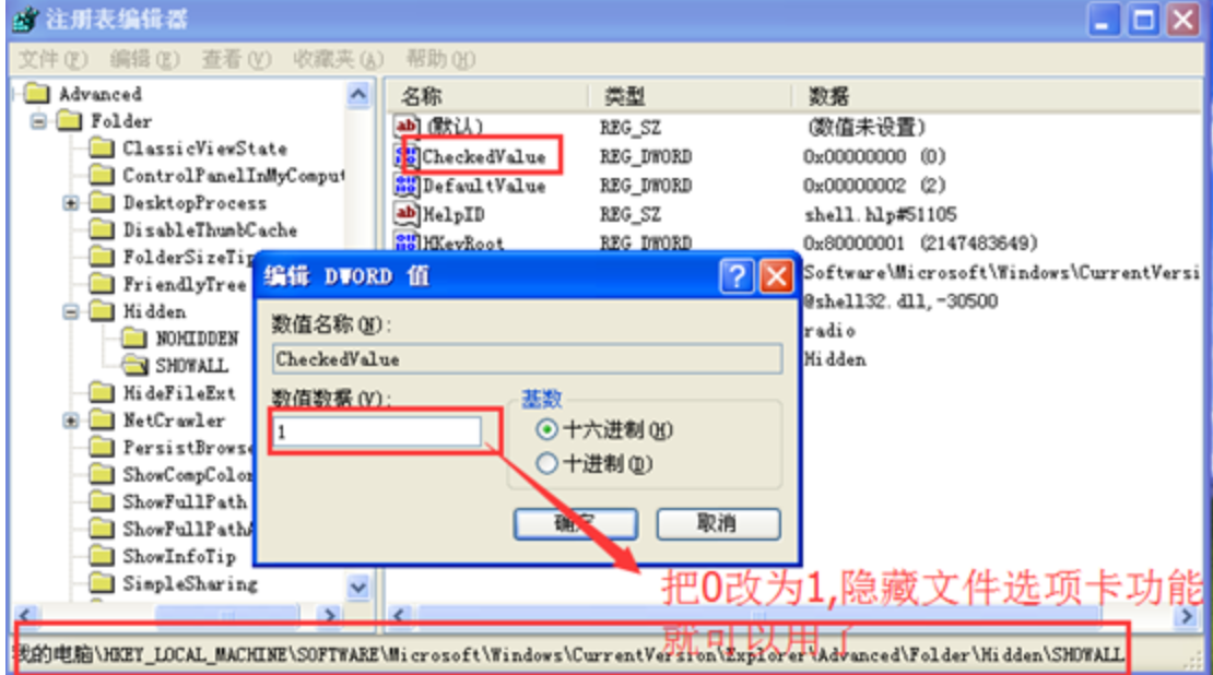 2. 无法手工修改“文件夹选项”将隐藏文件显示出来。(修改注册表)