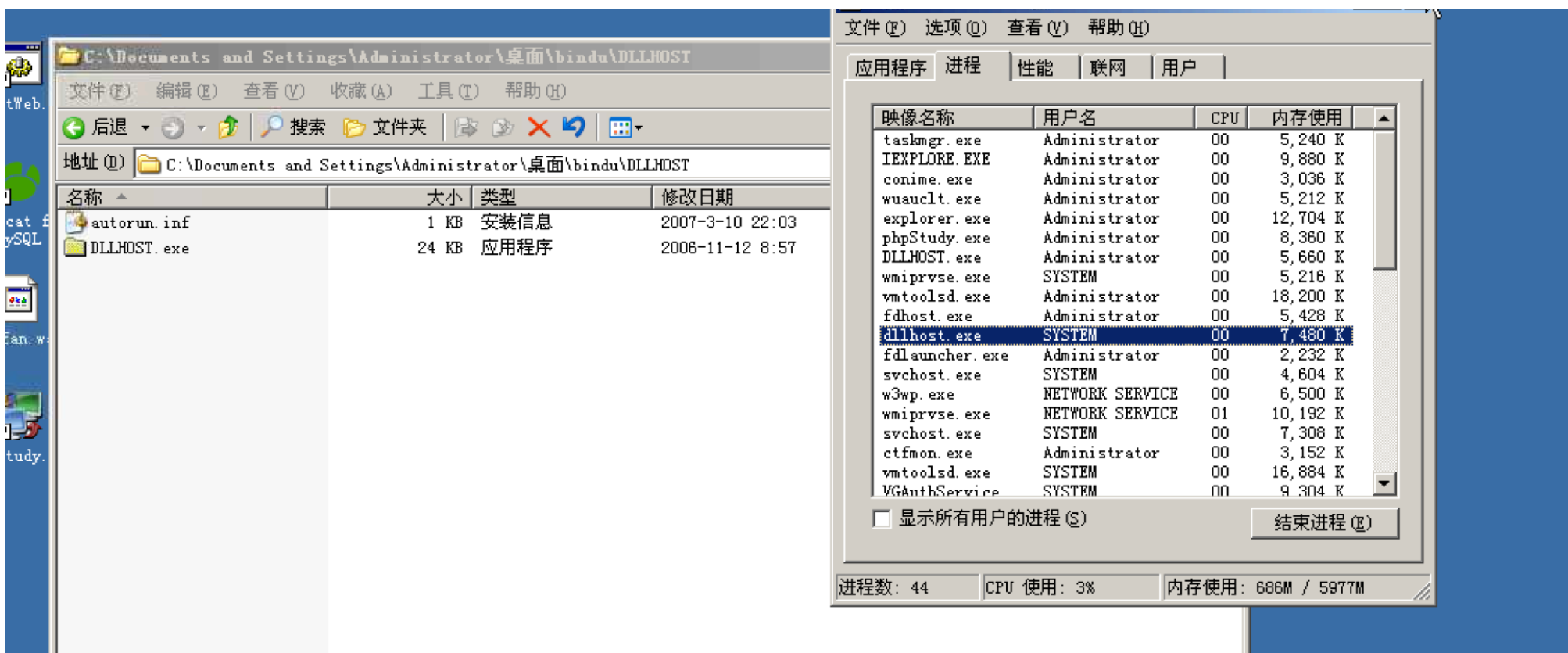 - 运行威金病毒,发现进程增加了一个DLLHOST.exe进程,说明病毒已运行:(特征:通过注册表加载,隐藏很深,autorun传播,U盘右键打开,不要双击打开,双击打开会自动运行病毒,操作系统自我保护机制 )