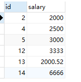 (SELECT casewhen salary < 2000 then'[0, 2000)'when salary >= 2000 and salary < 3000 then'[2000, 3000)'when salary >= 3000 and salary < 4000 then'[3000, 4000)'when salary >= 4000 and salary < 5000 then'[4000, 5000)'when salary >= 5000 then'[5000+)'end c,COUNT(*) co