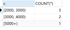 SELECT casewhen salary < 2000 then '[0, 2000)'when salary >= 2000 and salary < 3000 then '[2000, 3000)'when salary >= 3000 and salary < 4000 then '[3000, 4000)'when salary >= 4000 and salary < 5000 then '[4000, 5000)'when salary >= 5000 then '[5000+)'end c,COUNT(*)