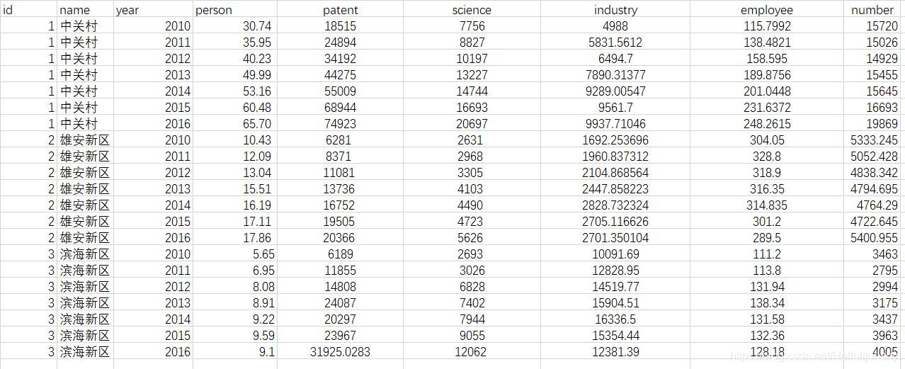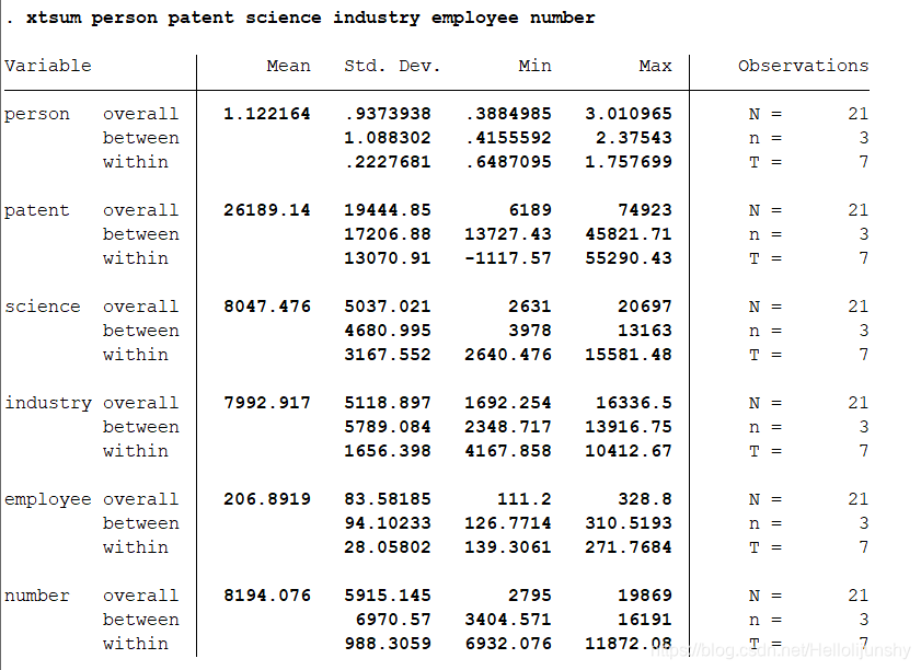 其次,看各个变量的情况,命令为:xtsum person patent science industry employee number命令执行后屏幕上会显示各个变量最大最小值、均值等信息: