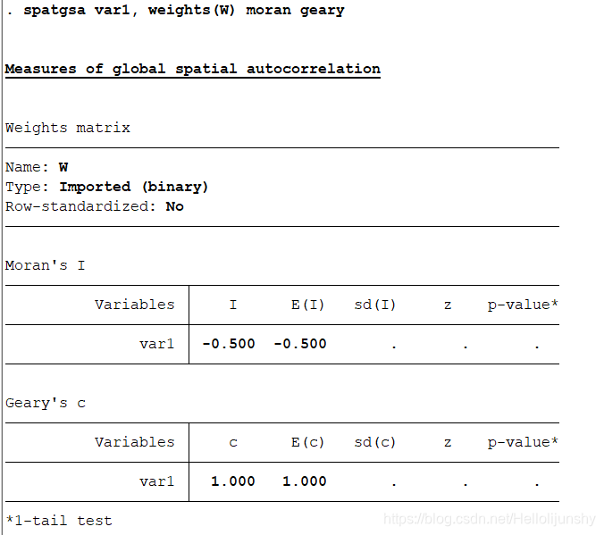 注:加上standardize表示对空间矩阵进行行标准化;w为提前输入的空间矩阵,空间矩阵有邻接权重、距离矩阵、经济权重等,在本例其形式是三行三列的形式,且顺序要和导入的面板数据个体顺序一致。