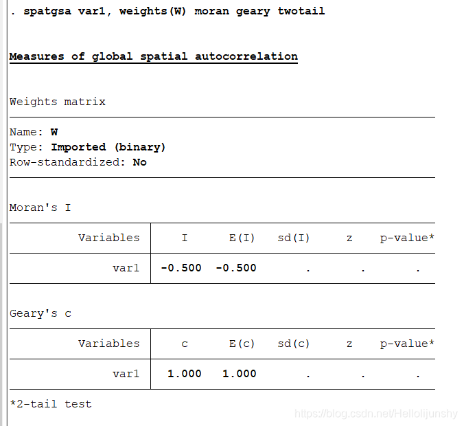 计算各变量Moran‘s I,Geary’s c及其双侧检验概率,执行命令:spatgsa person, weights(W) moran geary twotail