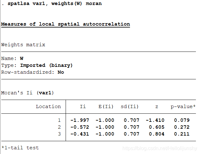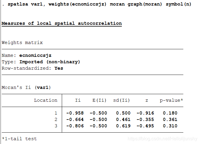 注:这是行标准化过的空间权重矩阵,ww为标准化的空间矩阵,下图用的ecnomicsjz是另一个经过行标准化的空间矩阵,道理都一样,只是变量名字不同。