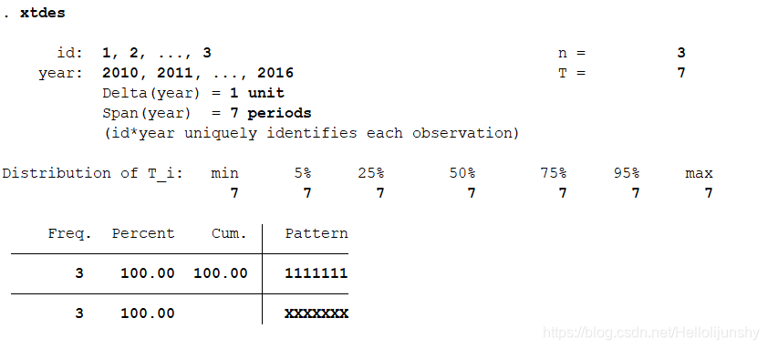 (2) 进行样本的描述性统计。首先我们看看样本的大体分布情况,命令为:xtdes 命令执行后屏幕上会显示: