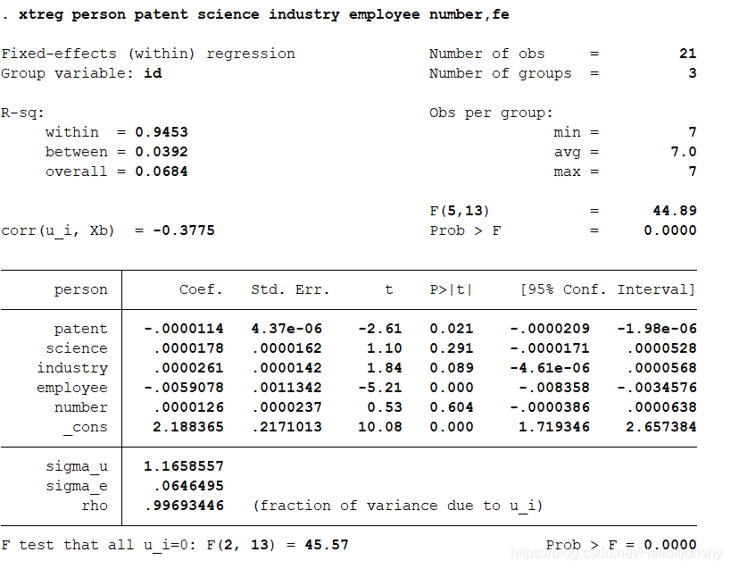 (1)先做固定效应面板数据模型回归方程结果,命令为:xtreg person patent science industry employee number,fe命令执行后屏幕上会显示: