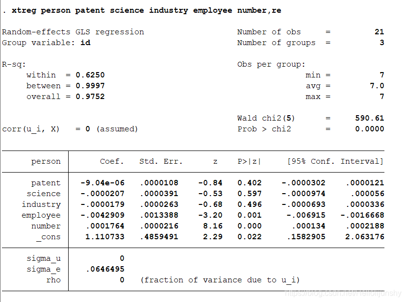 估计随机效应的命令为:xtreg person patent science industry employee number,re 命令执行后屏幕上会显示: