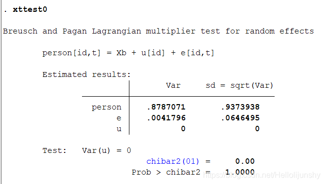 第二步:检验时间效应的显著性(混合效应还是随机效应好)(检验方法:LM统计量)命令为:xttest0